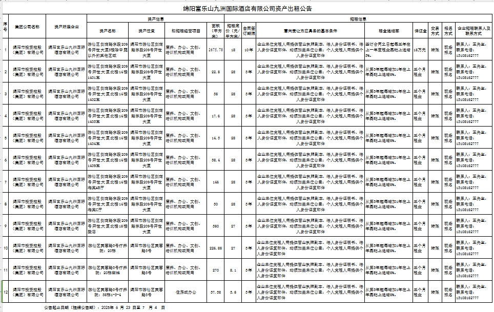 绵阳富乐山九洲国际酒店有限公司资产出租公告