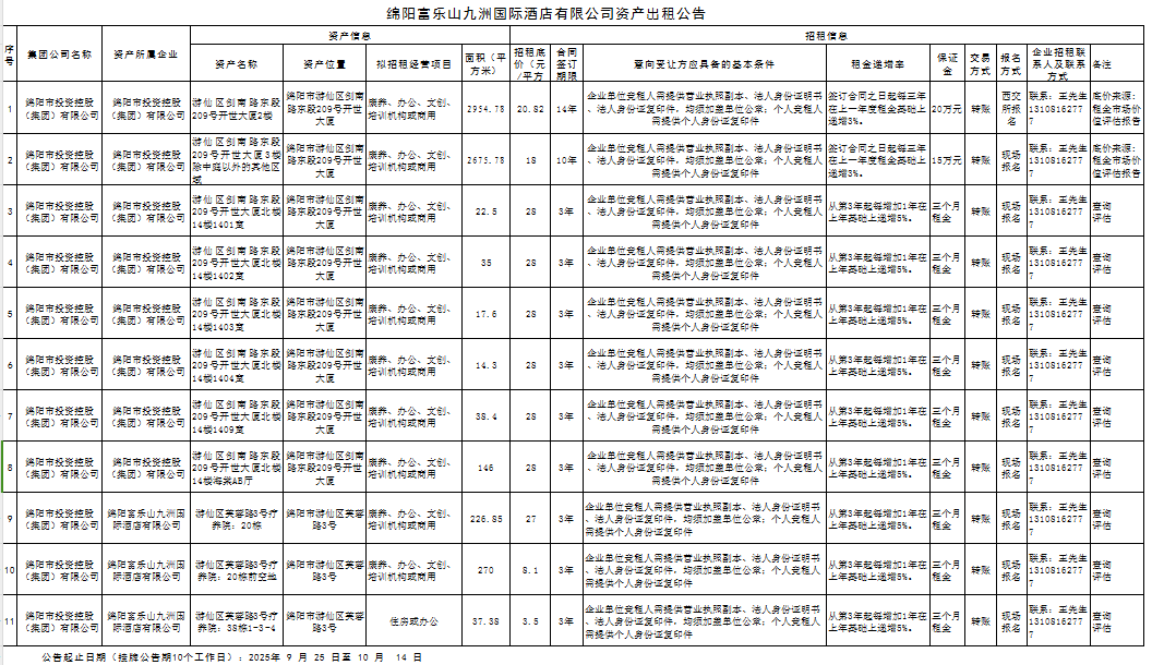 绵阳富乐山九洲国际酒店有限公司资产出租公告